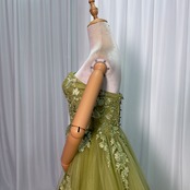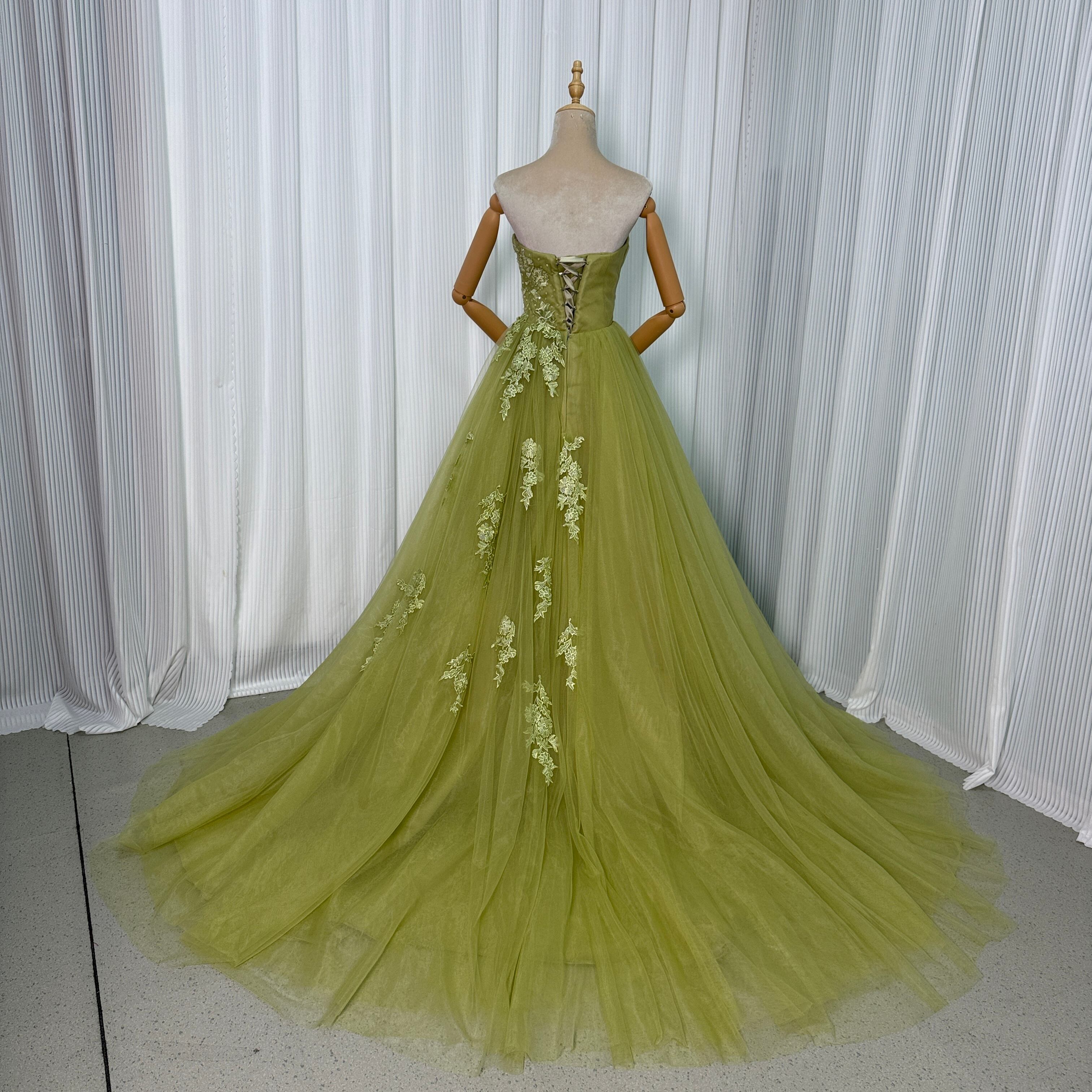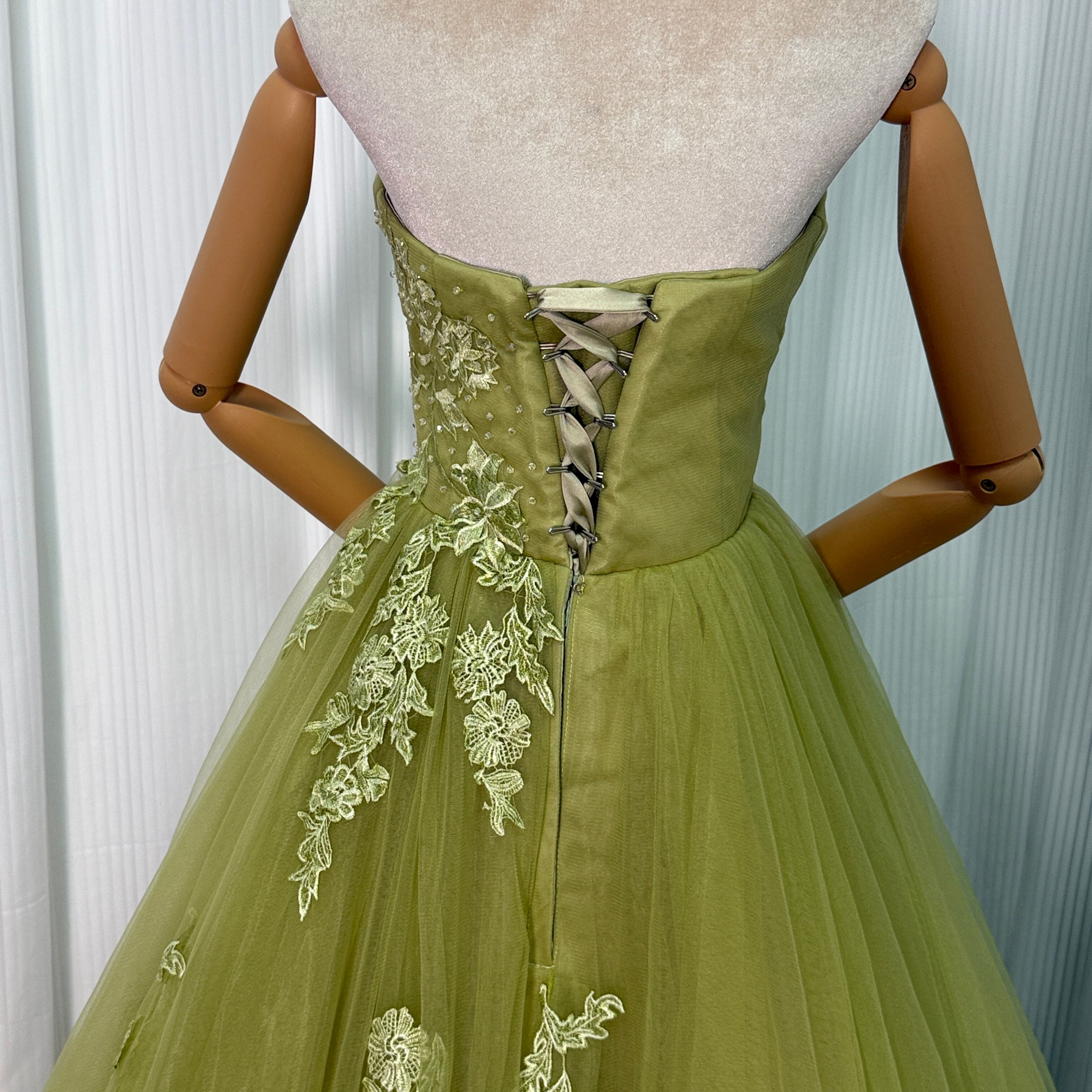 カラードレス グリーン グリーン ベアトップ 編み上げ トレーン チュールドレス 花嫁 前撮り