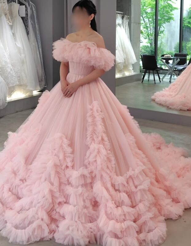 カラードレス ピンク オフショルダー 編み上げ フリルトレーン ソフトチュール ボリュームドレス 花嫁 前撮り