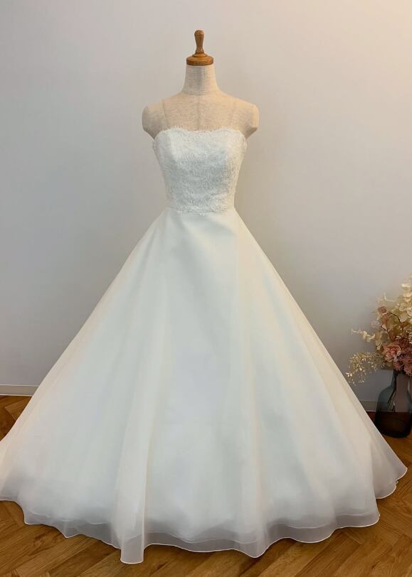 ウエディングドレス オフホワイト ベアトップ 繊細レース 編み上げ 華やかなトレーン アンティークなドレス 披露宴/結婚式