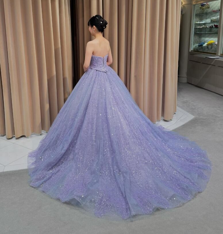 カラードレス パープル ベアトップ 編み上げ キラキラ光る刺繍 華やかなトレーン 花嫁 前撮り