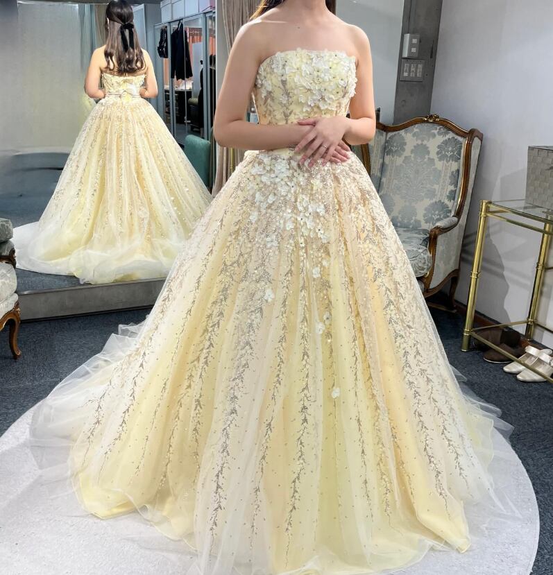 カラードレス 黄色い ベアトップ リーフ刺繍 3D立体レース刺繍 リボン トレーン 前撮り