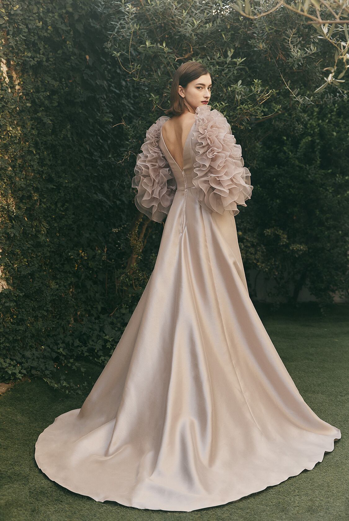 カラードレス ブラウン バックレス 取り外し袖 光沢サテン 華やかなトレーン オンショルダードレス 花嫁 前撮り 色直し
