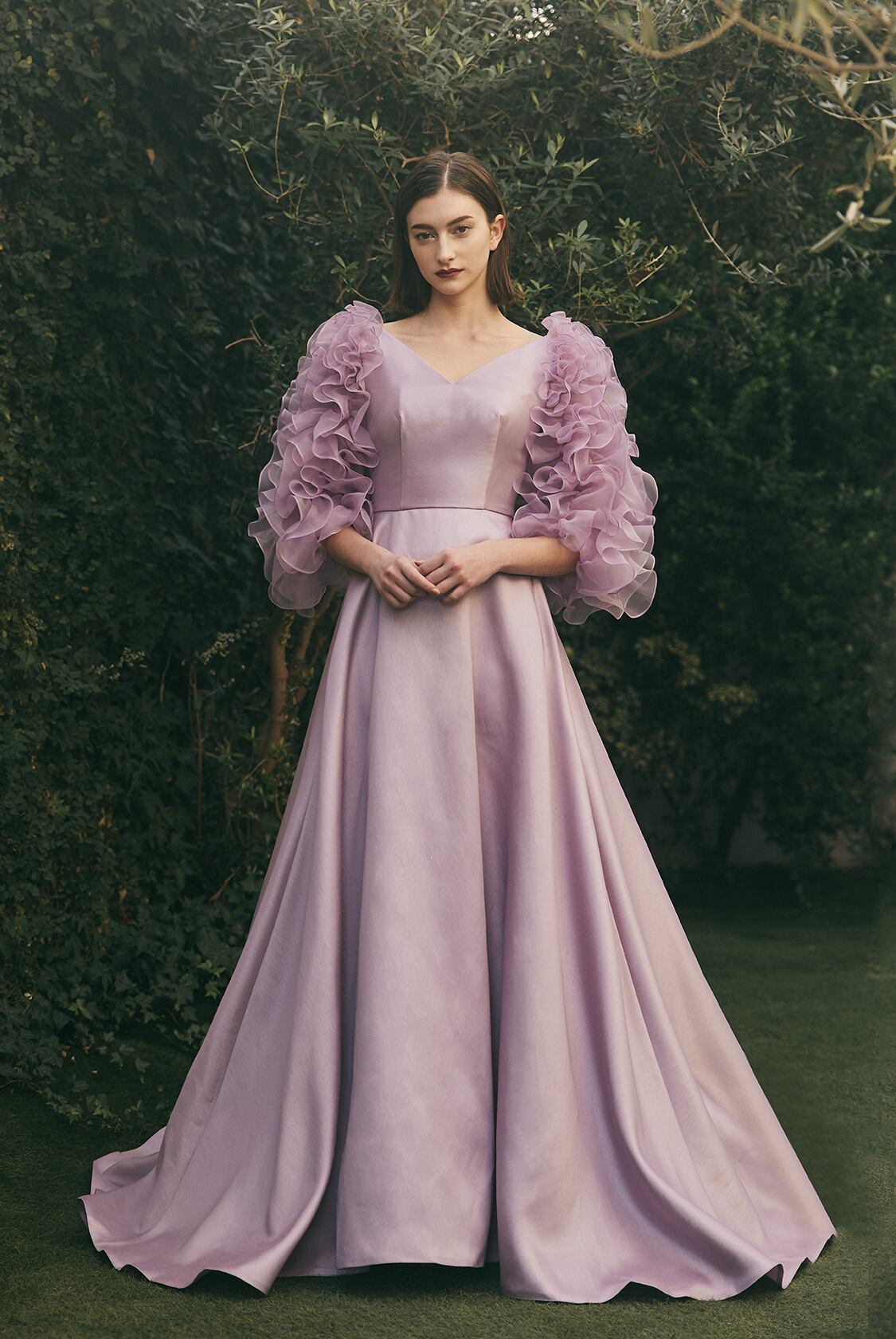 カラードレス ピンク バックレス 取り外し袖 光沢サテン 華やかなトレーン オンショルダードレス 花嫁 前撮り 色直し