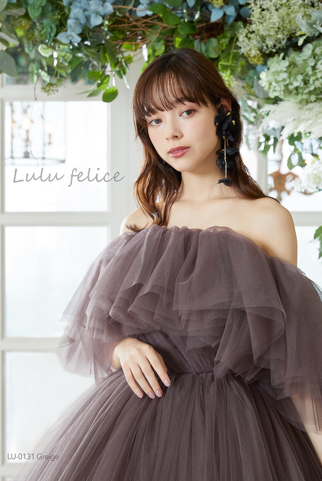 カラードレス 茶 取り外しオフショルダー サッシュベルト 柔らかく重ねたチュールスカート 華やかなトレーン 披露宴/結婚式