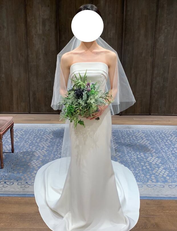 ウエディングドレス ホワイト ベアトップ 光沢サテン 短トレーン ショートベール ソフトマーメイドライン 結婚式 前撮り