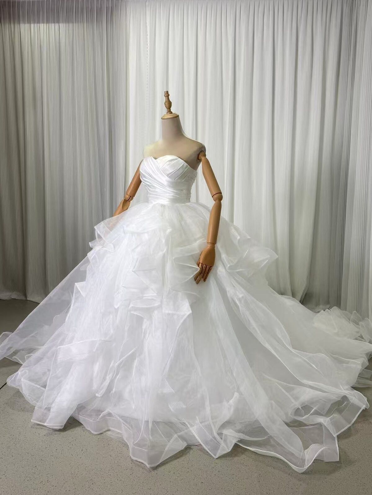 ウエディングドレス ホワイト ベアトップ 編み上げ ソフトチュール 華やかなトレーン ボリュームドレス 披露宴/結婚式