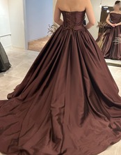 カラードレス テラコッタ色 チューブトップ 編み上げ 光沢サテン レース レイヤードドレス ピアノ演奏会/音楽会/発表会など