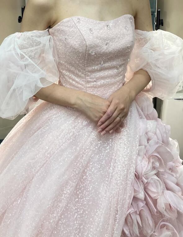 カラードレス くすみピンク パフスリーブ バラトレーン 編み上げ 華やかなトレーン キラキラグリッターチュール プリンセスライン 花嫁 前撮り