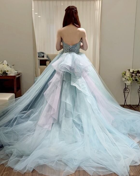 カラードレス 爽やかで優しいブルー オフショルダー パール 編み上げ ソフトチュール キラキラ光る刺繍 華やかなトレーン 花嫁 前撮り