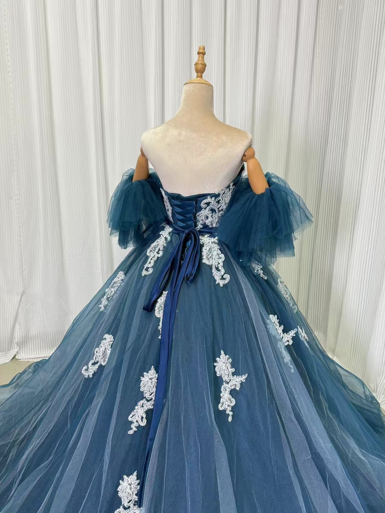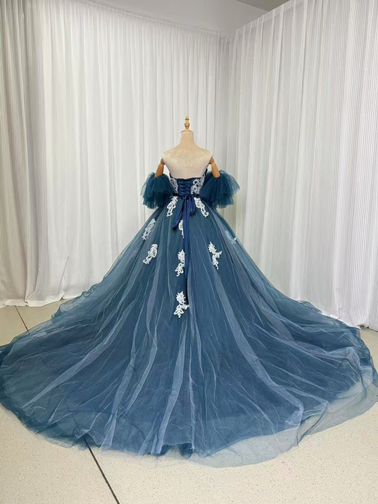 カラードレス ブルー フリル袖 編み上げ サッシュベルト 繊細レース ソフトチュール 色直し 華やかなトレーン 披露宴/結婚式 前撮り