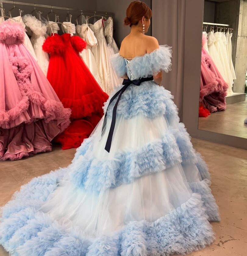 カラードレス 爽やかで優しいブルー オフショルダー サッシュベルト 編み上げ 華やかなトレーン もこもこドレス 花嫁 前撮り