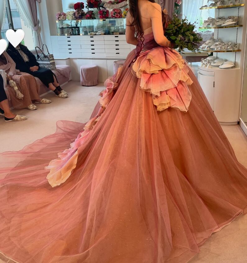 カラードレス テラコッタ色 ベアトップ バラトレーン 編み上げ ソフトチュール 華やかなトレーン 花嫁 前撮り