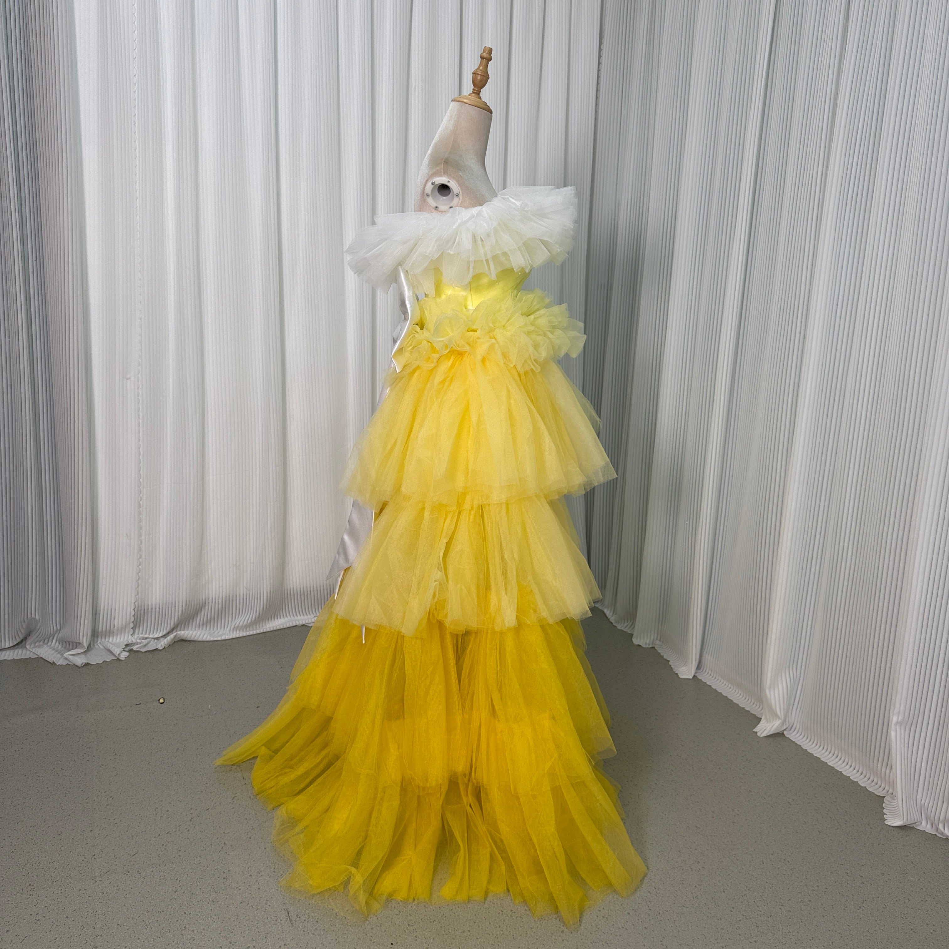 カラードレス 黄色い オフショルダー フィッシュテール ふっくら柔らかなバックリボン ソフトチュール 花嫁 前撮り ティアードのドレス