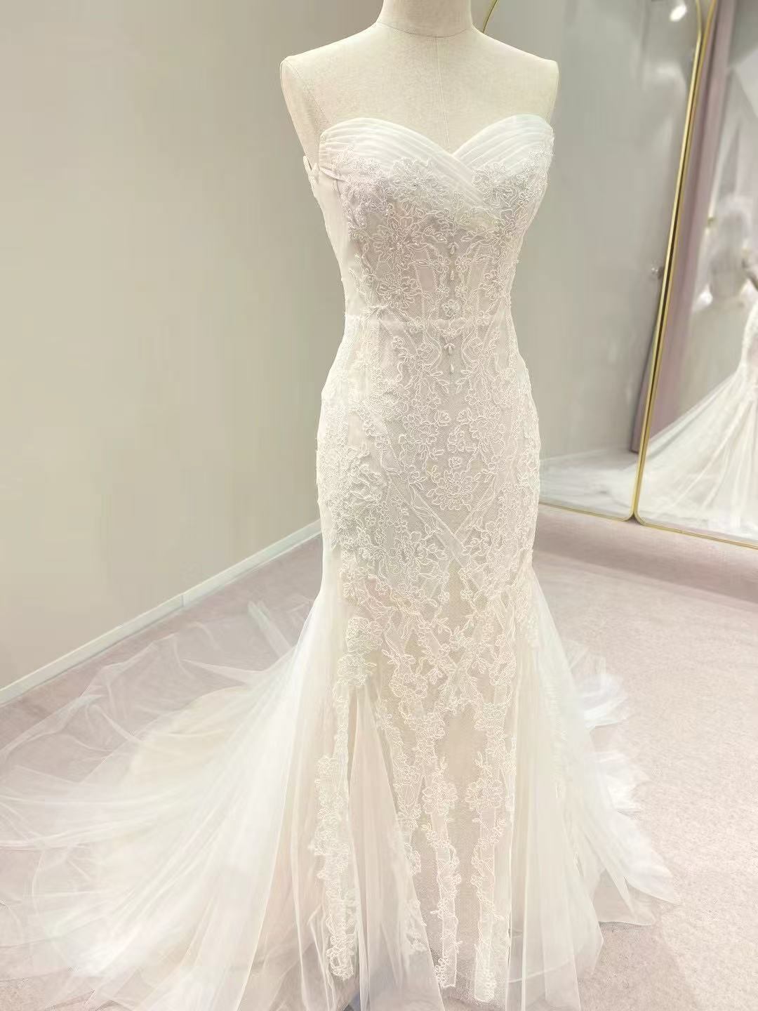 ウエディングドレス オフホワイト 取り外し袖 繊細レース 編み上げ 短トレーン マーメイドライン 披露宴/結婚式 前撮り