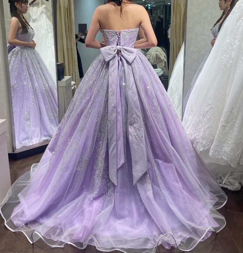 カラードレス パープル ベアトップ パール キラキラ光る刺繍 ふっくら柔らかなバックリボン 短トレーン 花嫁 前撮り