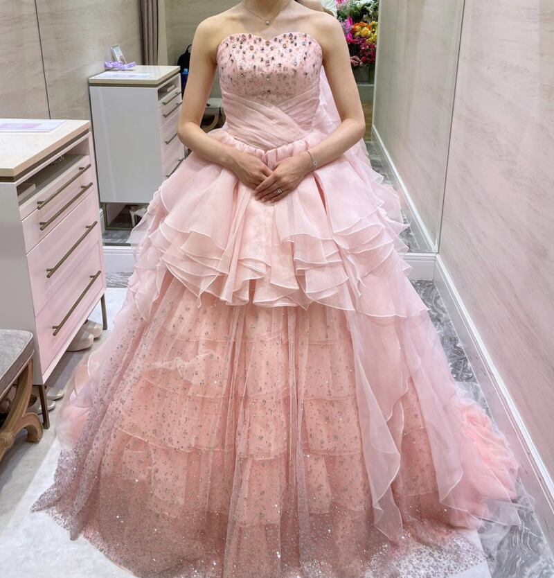 カラードレス ピンク ベアトップ 編み上げ キラキラチュール 柔らかく重ねたチュールスカート カラーストーン 花嫁 前撮り