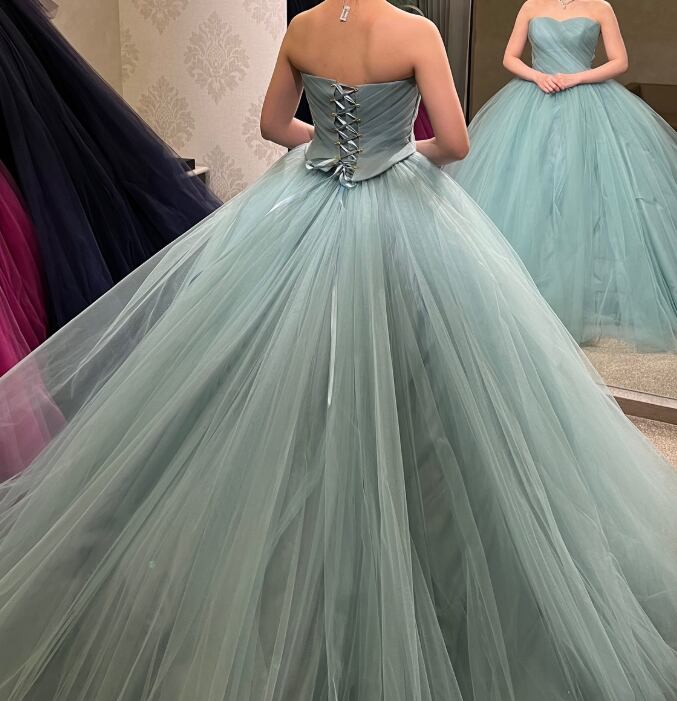 カラードレス ミントグリーンドレス ベアトップ スリット 編み上げ ソフトチュール 華やかなトレーン フレアスカート 花嫁 前撮り
