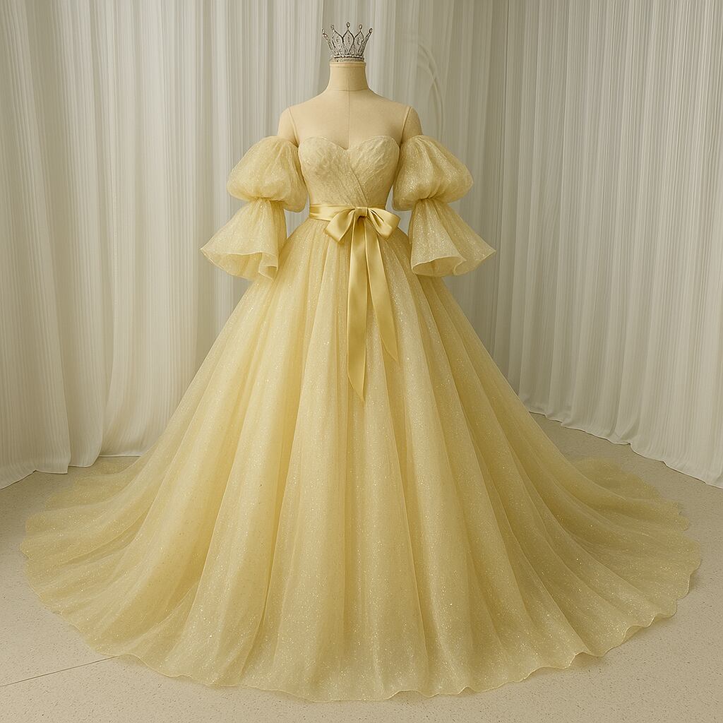 カラードレス パステルイエロー 姫袖 編み上げ サッシュベルト キラキラグリッターチュール 華やかなトレーン 目立つ 色直し 花嫁