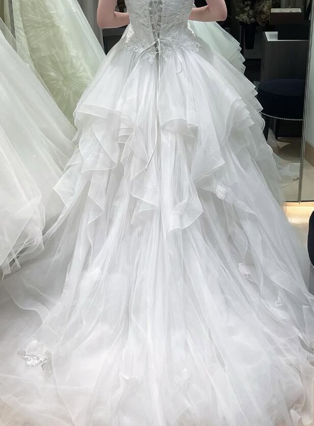 ウエディングドレス ベアトップ 繊細レース 編み上げ ソフトチュール 華やかなトレーン ホワイト 結婚式 前撮り
