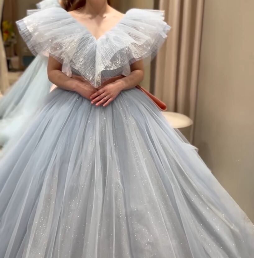 カラードレス 爽やかで優しいブルー 取り外しオフショルダー 編み上げ キラキラグリッターチュール ふっくら柔らかなバックリボン 華やか 披露宴/結婚式