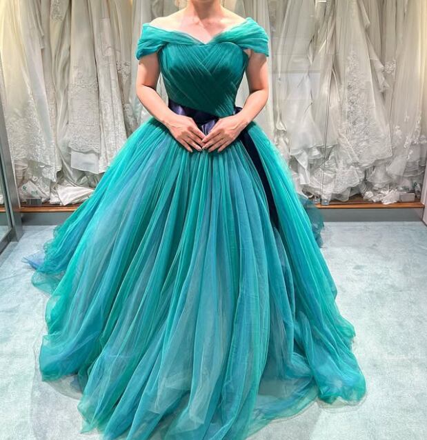 カラードレス 薄青 オフショルダー 編み上げ サッシュベルト ソフトチュール 華やかなトレーン 花嫁 前撮り