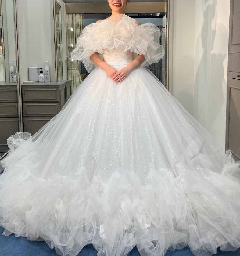 ウエディングドレス ホワイト 取り外しオフショルダー サッシュベルト フリルトレーン キラキラグリッターチュール 披露宴/結婚式 ブライダル
