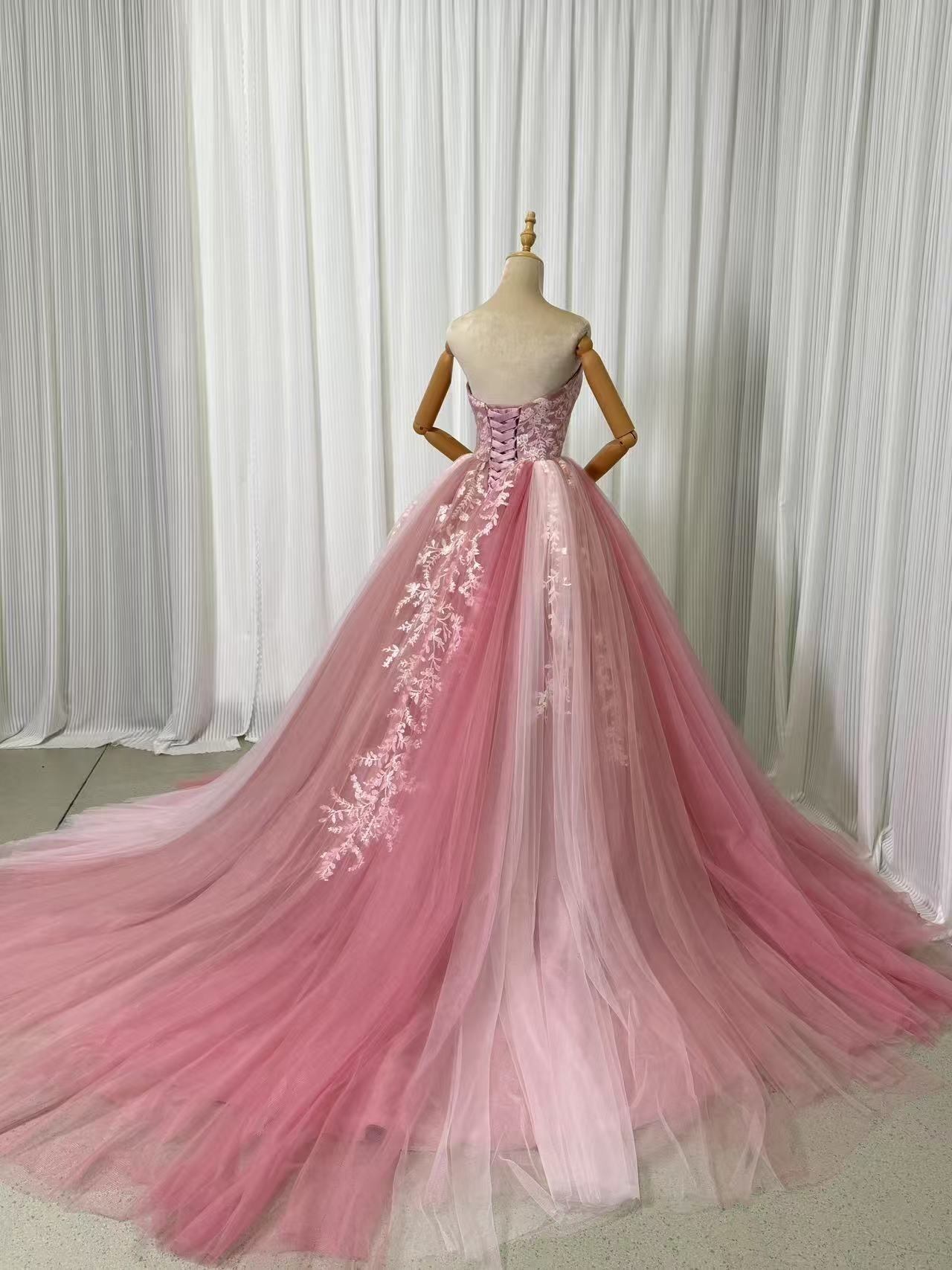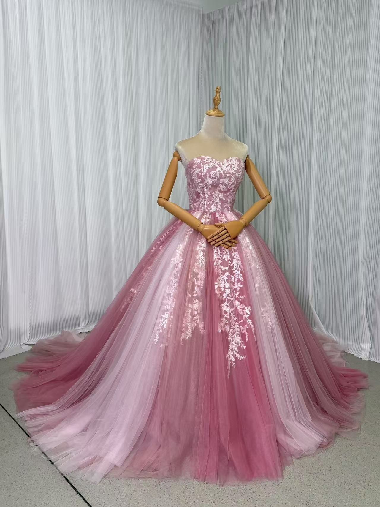 カラードレス ピンク ベアトップ 編み上げ キラキラ光る刺繍 華やかなトレーン ソフトチュール 花嫁 前撮り