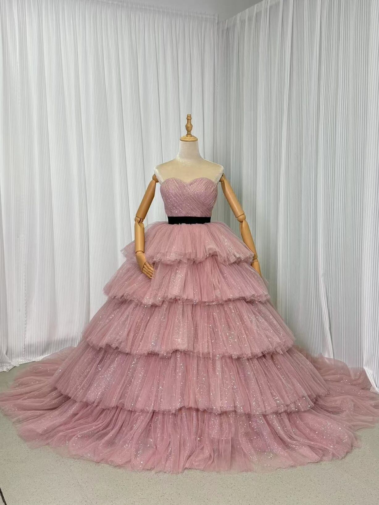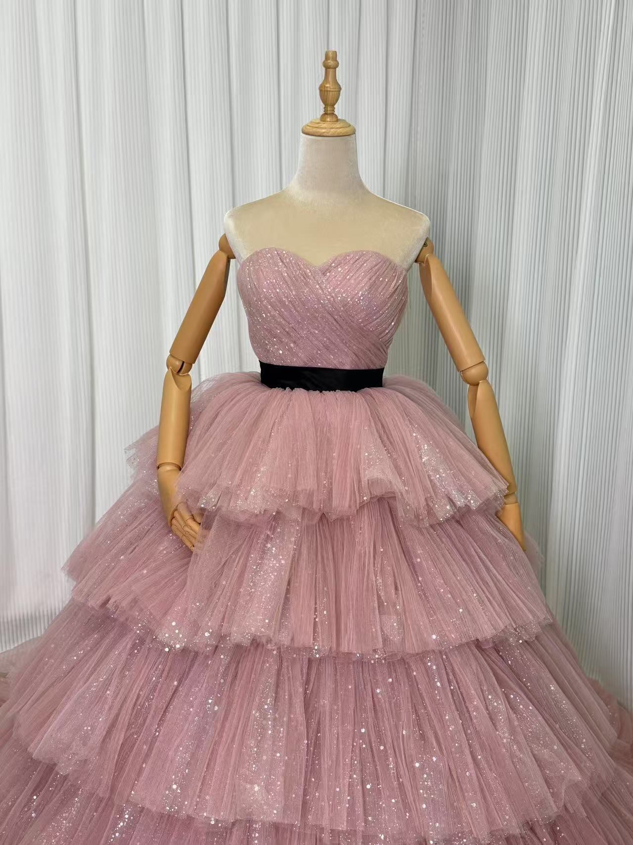 カラードレス くすみピンク キラキラグリッターチュール ベアトップ 編み上げ サッシュベルト ティアードのドレス 華やかなトレーン 披露宴/結婚式 前撮り