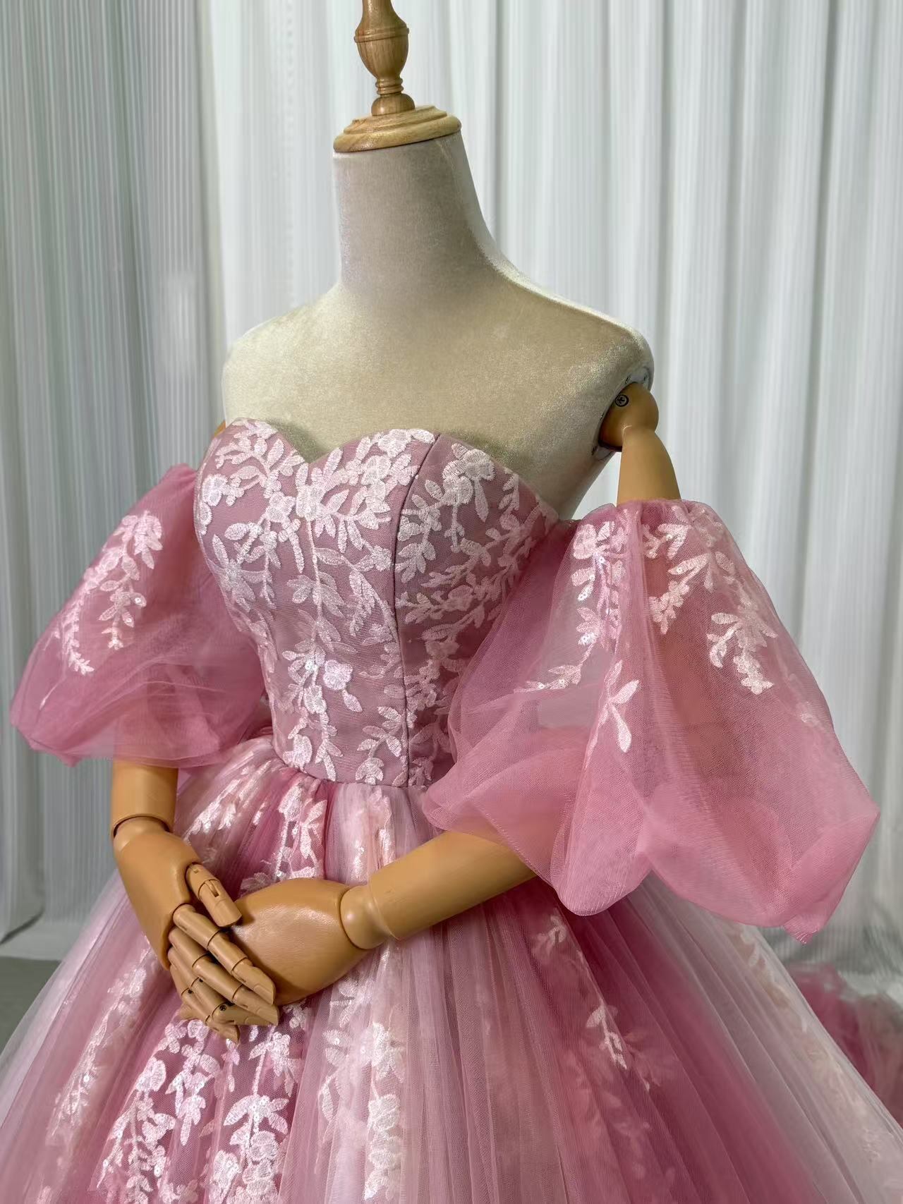 カラードレス ピンク パフスリーブ 編み上げ キラキラ光る刺繍 華やかなトレーン ソフトチュール 花嫁 前撮り