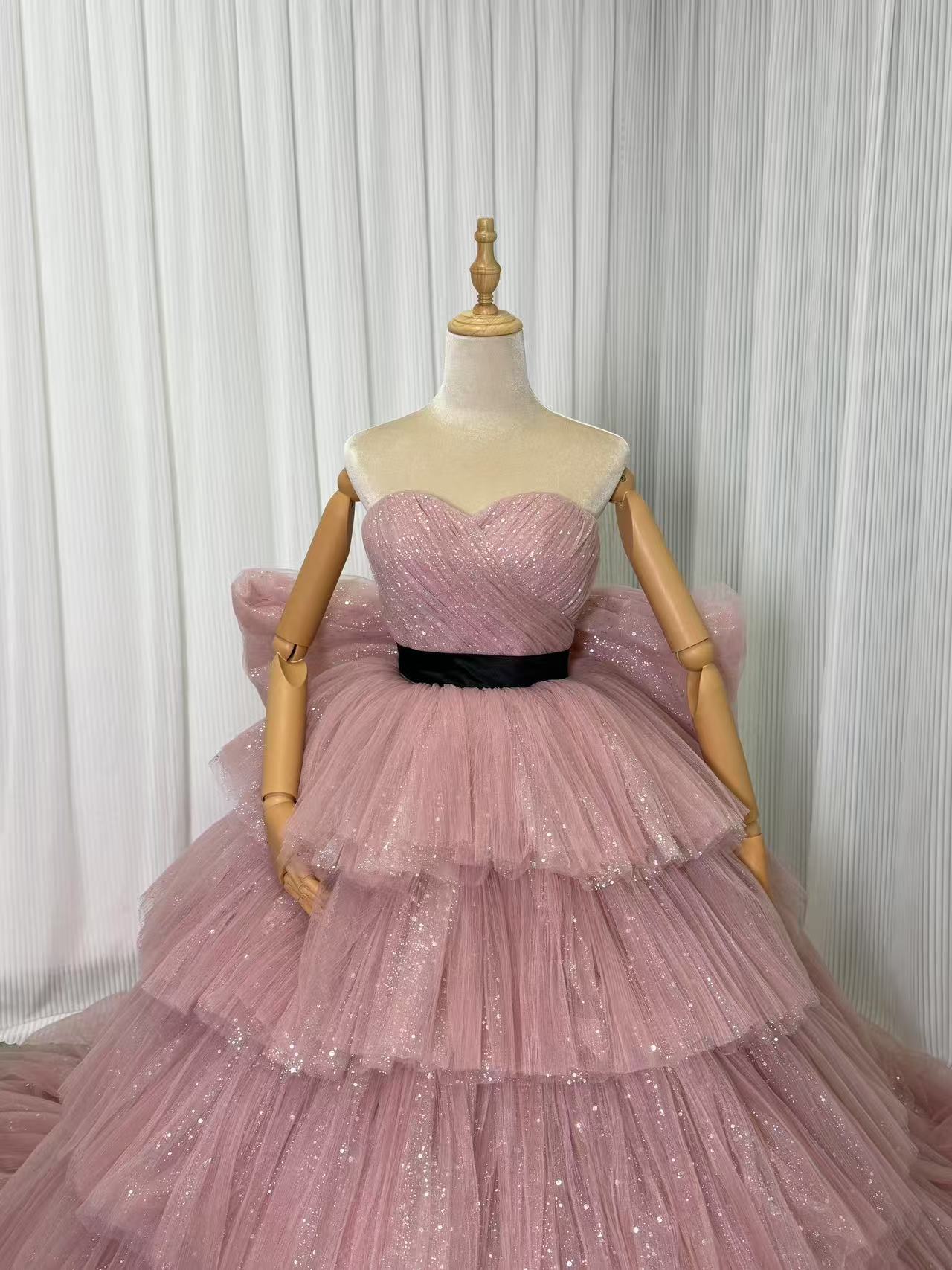 カラードレス くすみピンク キラキラグリッターチュール ふっくら柔らかなバックリボン ベアトップ 編み上げ サッシュベルト ティアードのドレス 華やかなトレーン 披露宴/結婚式 前撮り