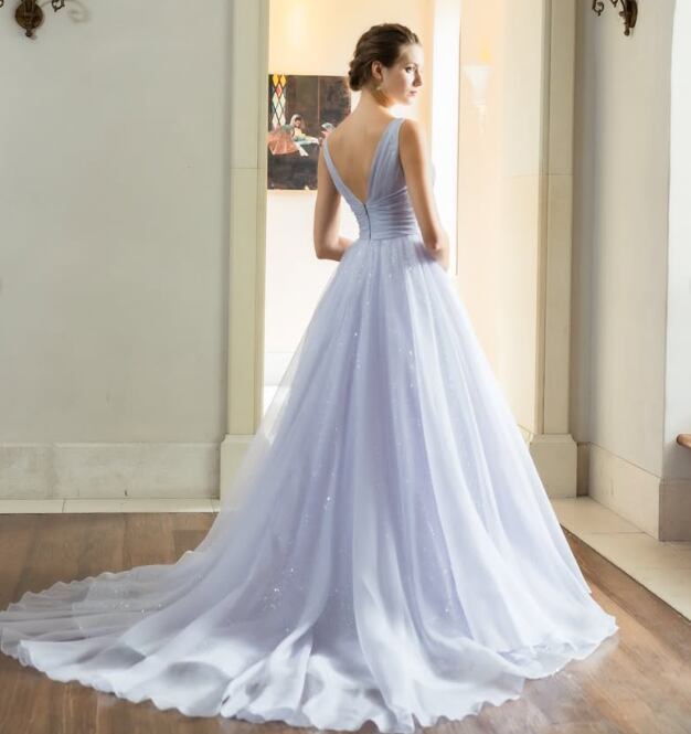 カラードレス オーキッド キラキラグリッターチュール ファスナー トレーン 高みせ 绮丽な Vネックドレス 花嫁 前撮り