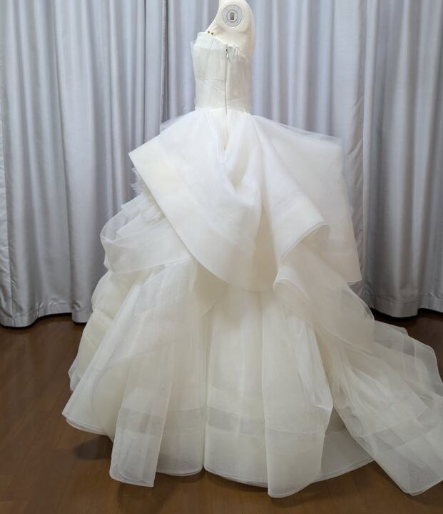 ウエディングドレス オフホワイト ベアトップ ファスナー ラッフルフリル ふわふわドレス ロング 披露宴/結婚式