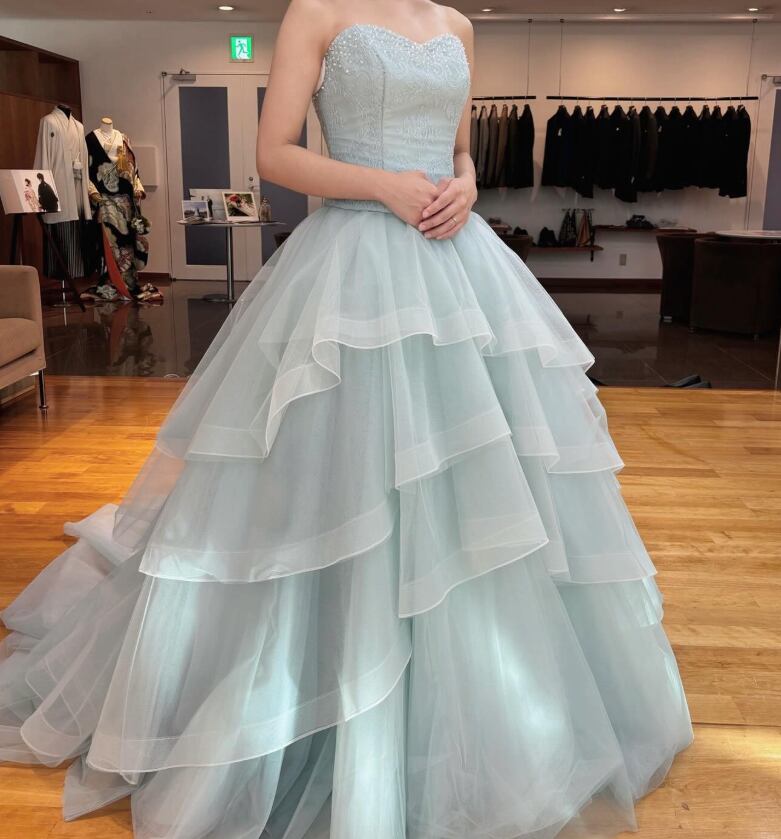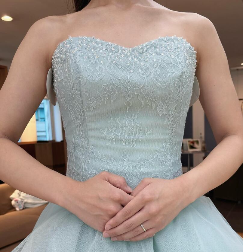 カラードレス 爽やかで優しいブルー ベアトップ ビジュー レース 編み上げ 華やかなトレーン ソフトチュール 花嫁 前撮り