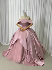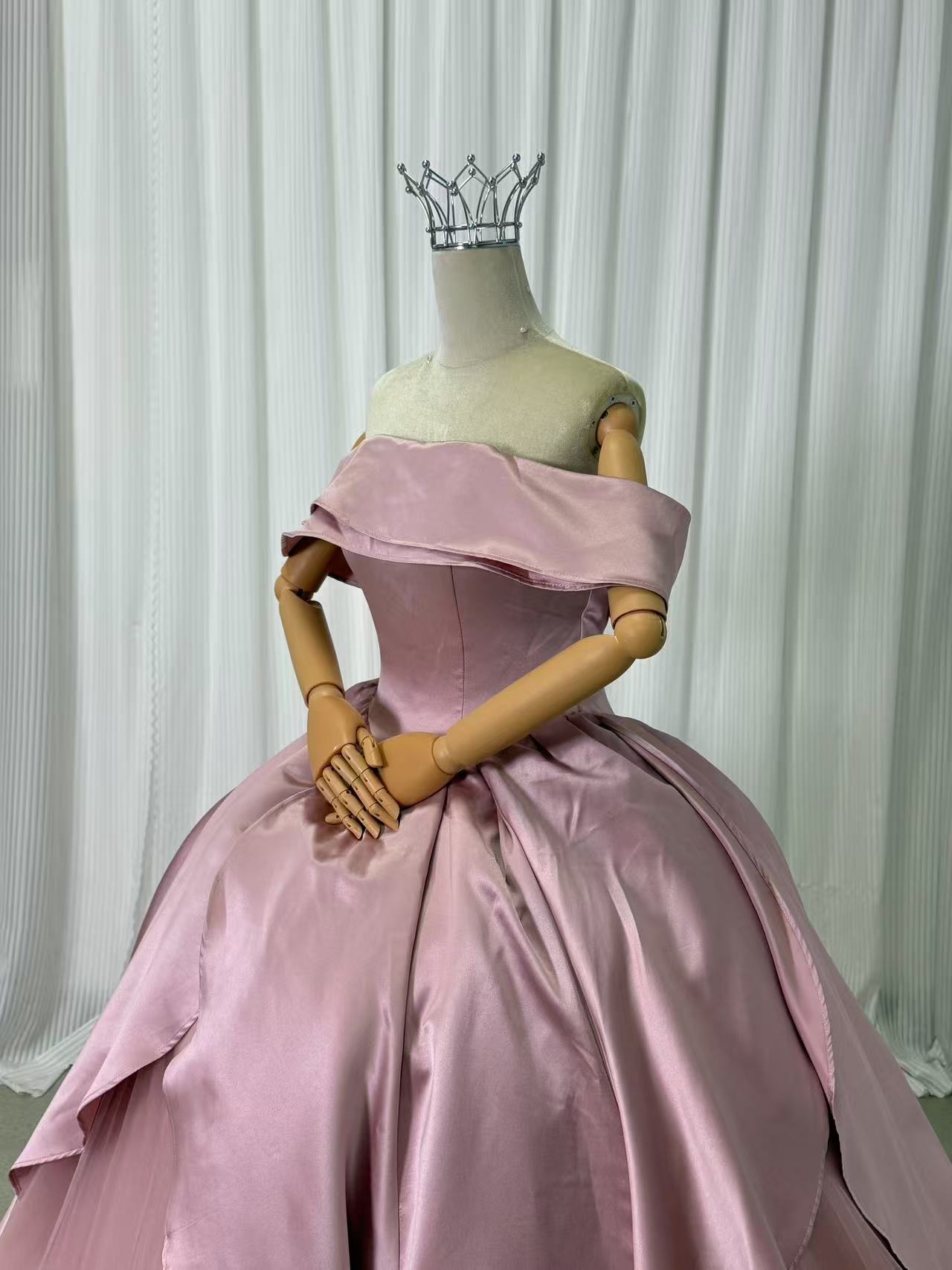 カラードレス ピンク オフショルダー 編み上げ プリンセスライン 光沢サテン ソフトチュール 華やかなトレーン 結婚式 前撮り レイヤードドレス