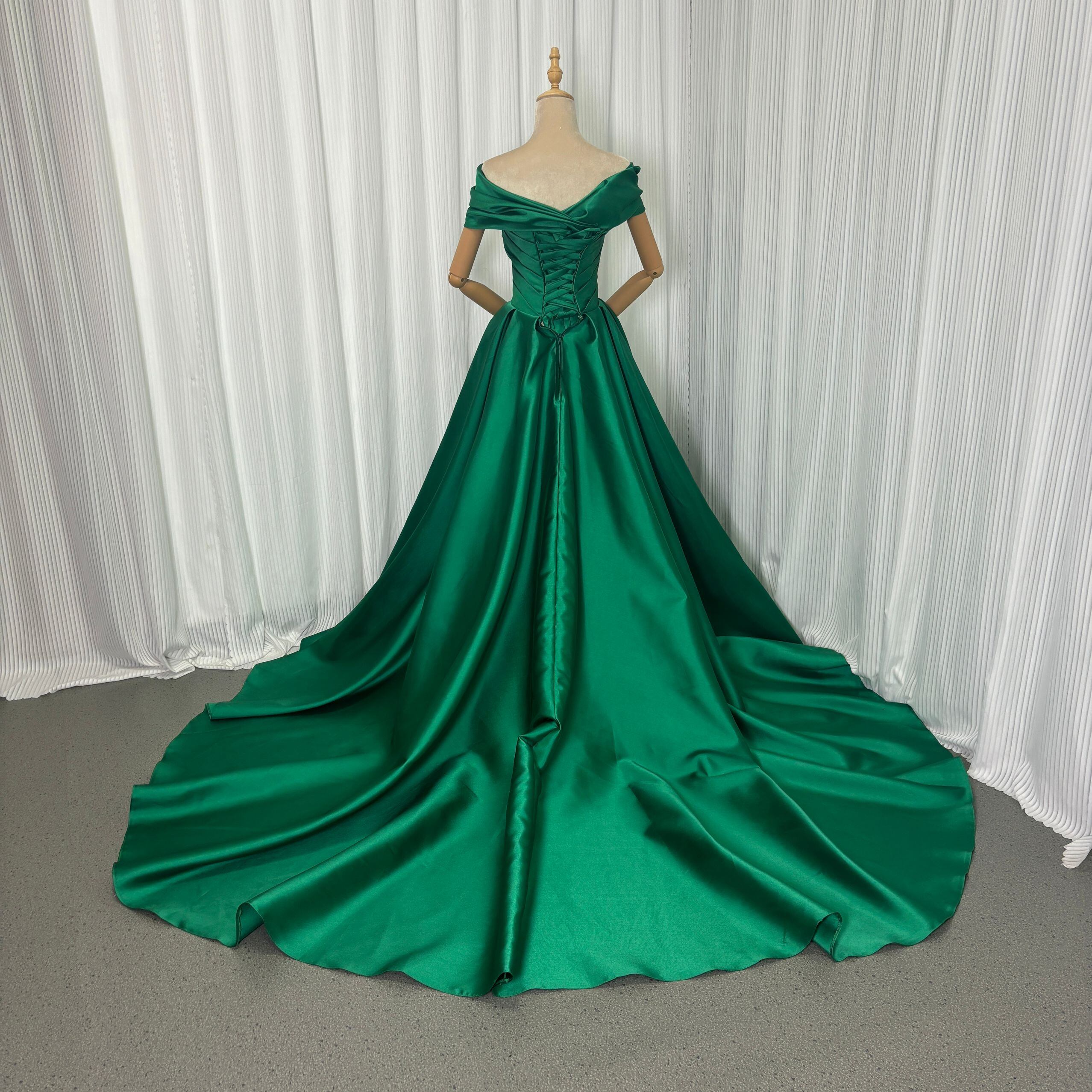 カラードレス グリーン オフショルダー ミカドサテン 編み上げ 華やかなトレーン 披露宴/結婚式 前撮り