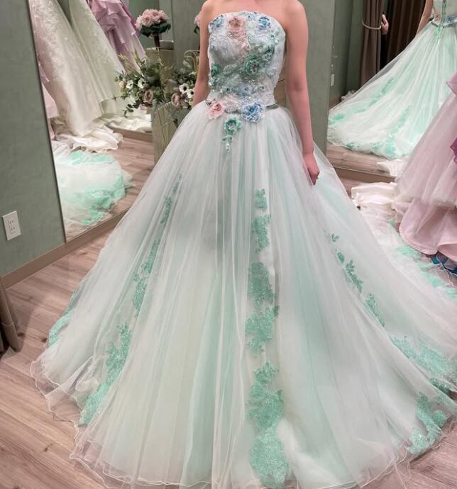 カラードレス グリーン 3D立体レース刺繍 編み上げ ベアトップ ソフトチュール トレーン 前撮り ピアノ演奏会/音楽会