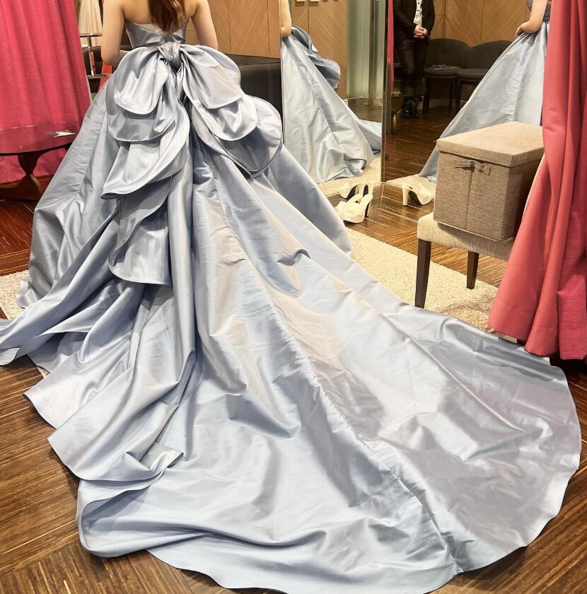 カラードレス 爽やかで優しいブルー ベアトップ ふっくら柔らかなバックリボン 光沢サテン 華やかなトレーン スリット 花嫁 前撮り