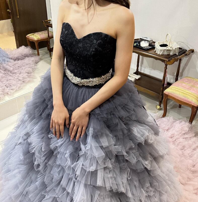 カラードレス アシメドレス ベアトップ 編み上げ ふっくら柔らかなバックリボン 柔らかく重ねたチュールスカート フレアスカート 花嫁 前撮り
