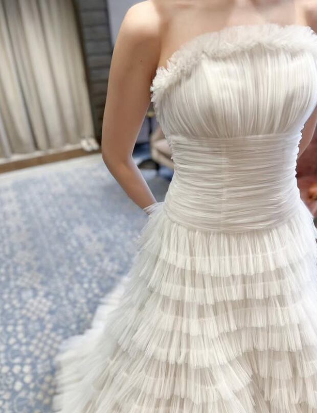 ウエディングドレス オフホワイト ベアトップ ファスナー 短トレーン プリーツドレス 前撮り