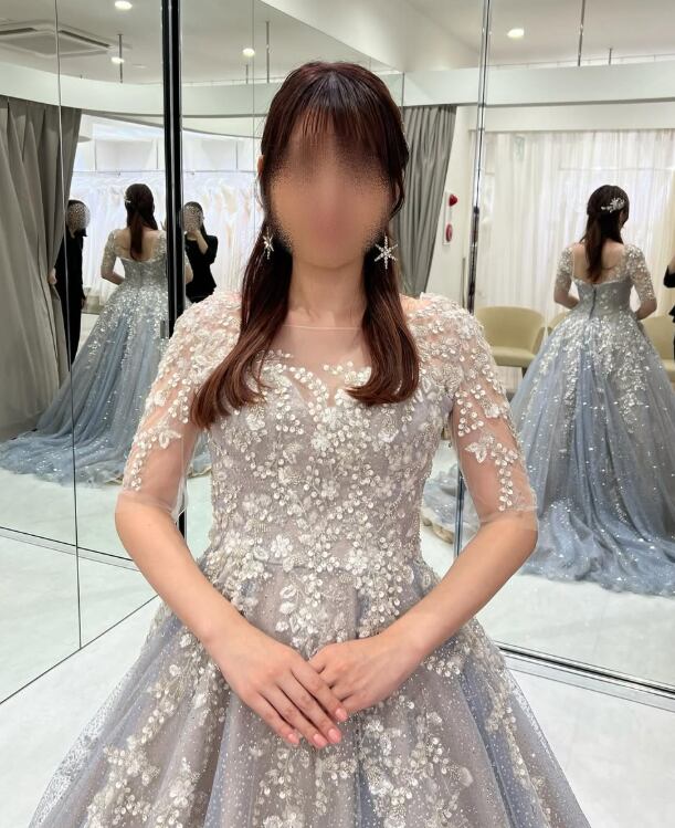 カラードレス ブルー ラウンドネック 短袖 キラキラスパンコール ファスナー 精緻な刺繍 キラキラグリッターチュール 華やかなトレーン 結婚式