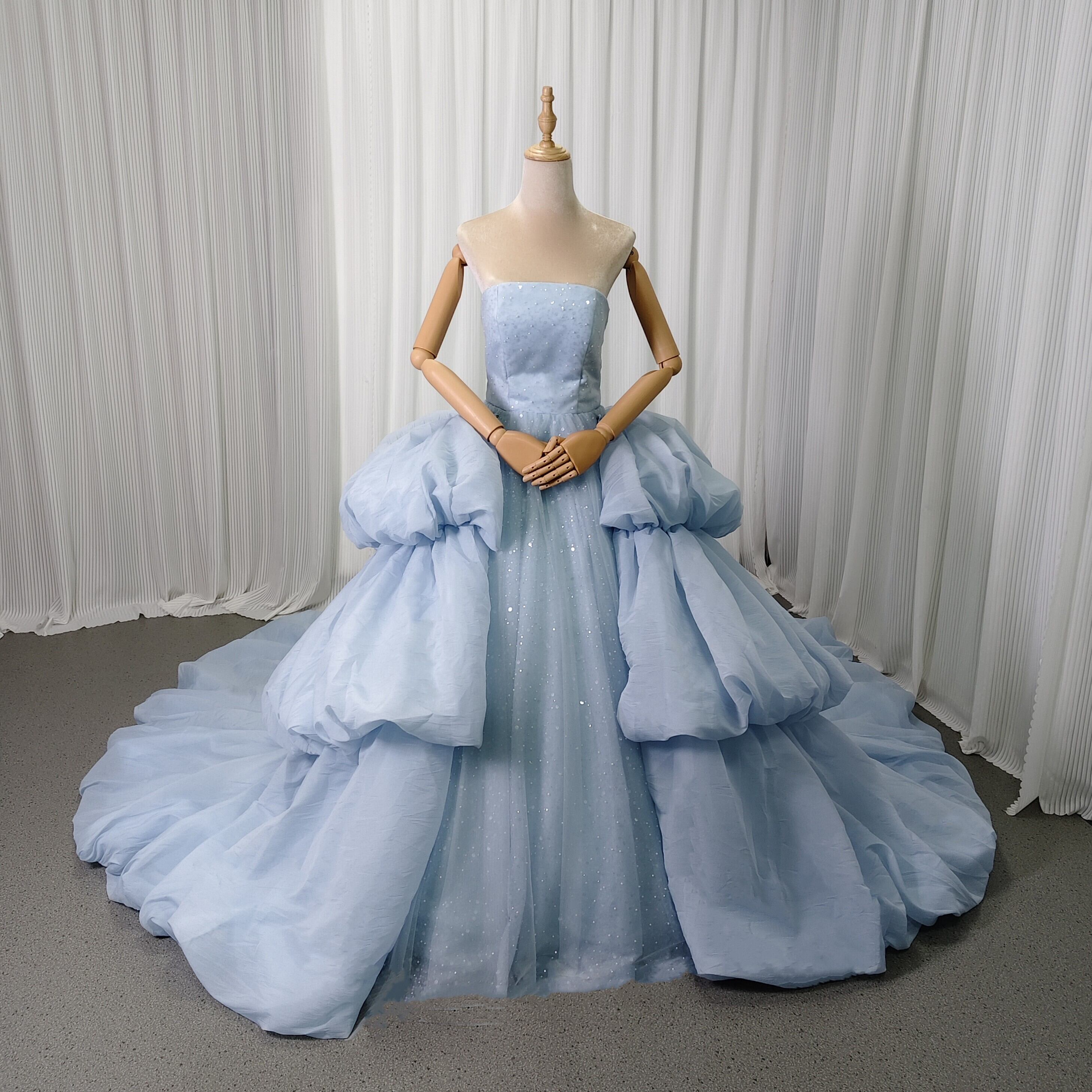 カラードレス 爽やかで優しいブルー ベアトップ キラキラグリッターチュール 華やかなトレーン レイヤードドレス 結婚式
