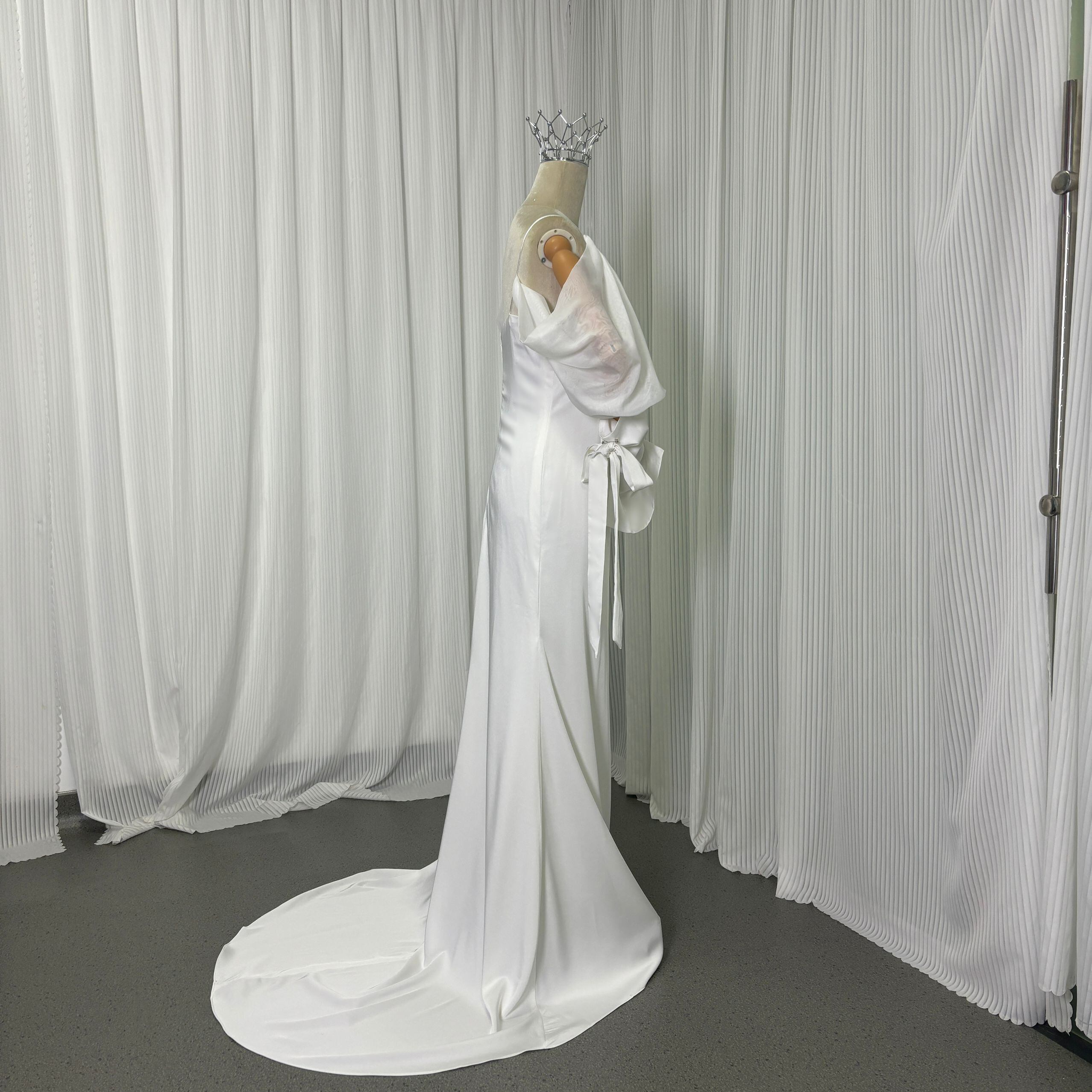 ウエディングドレス オフホワイト 高級イタリアサテン ロングスリーブ ファスナー キャミソール 細見えシルエット 披露宴/結婚式 前撮り