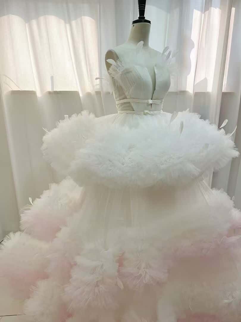 豪華! カラードレス ホワイト ピンク Vネック ベアトップ ソフトチュール グラデーションドレス フレアスカート 可愛い 披露宴/結婚式