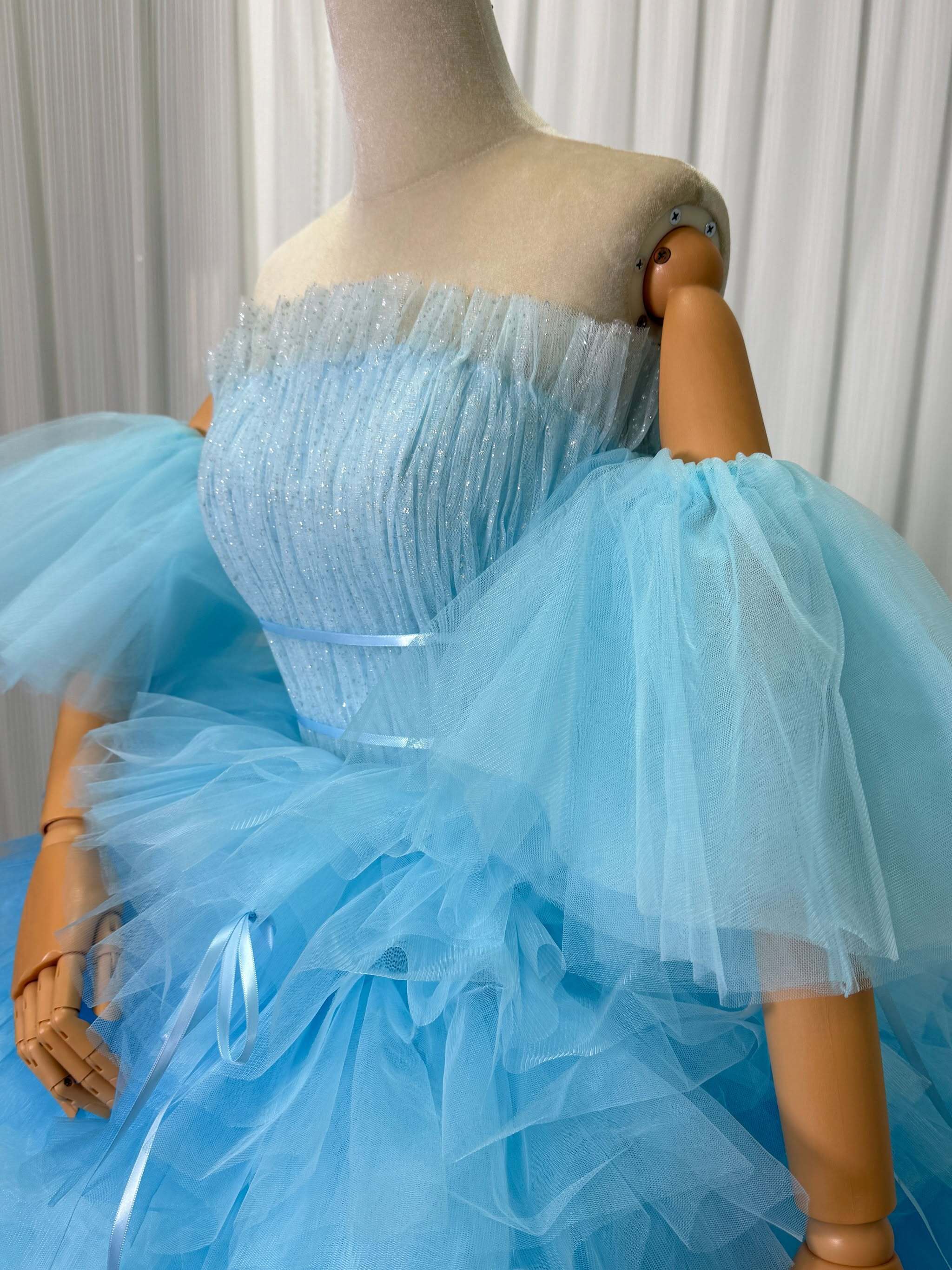 実例写真! カラードレス 爽やかで優しいブルー フリル袖 柔らかく重ねたチュールスカート 華やかなトレーン 披露宴/結婚式 フレアスカート