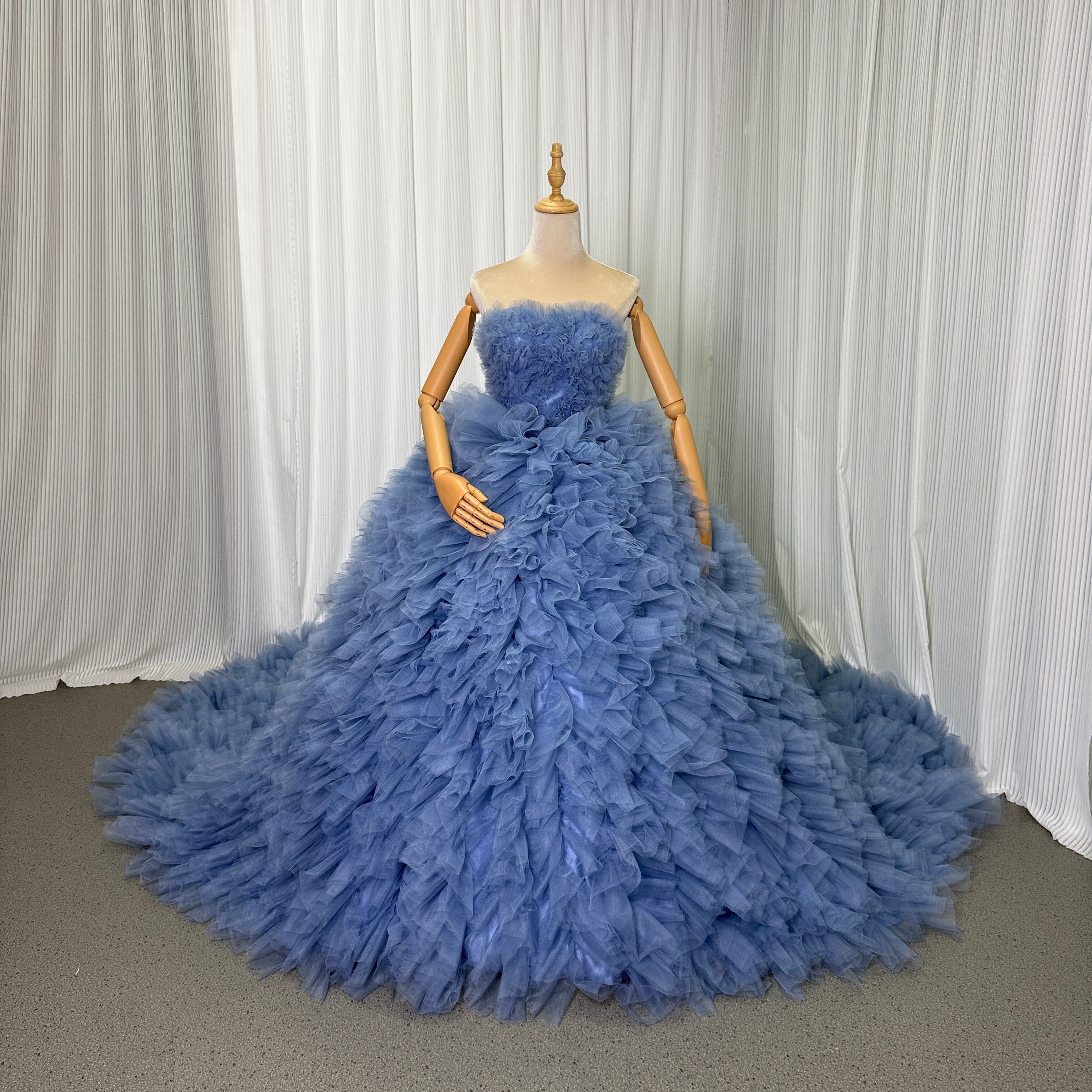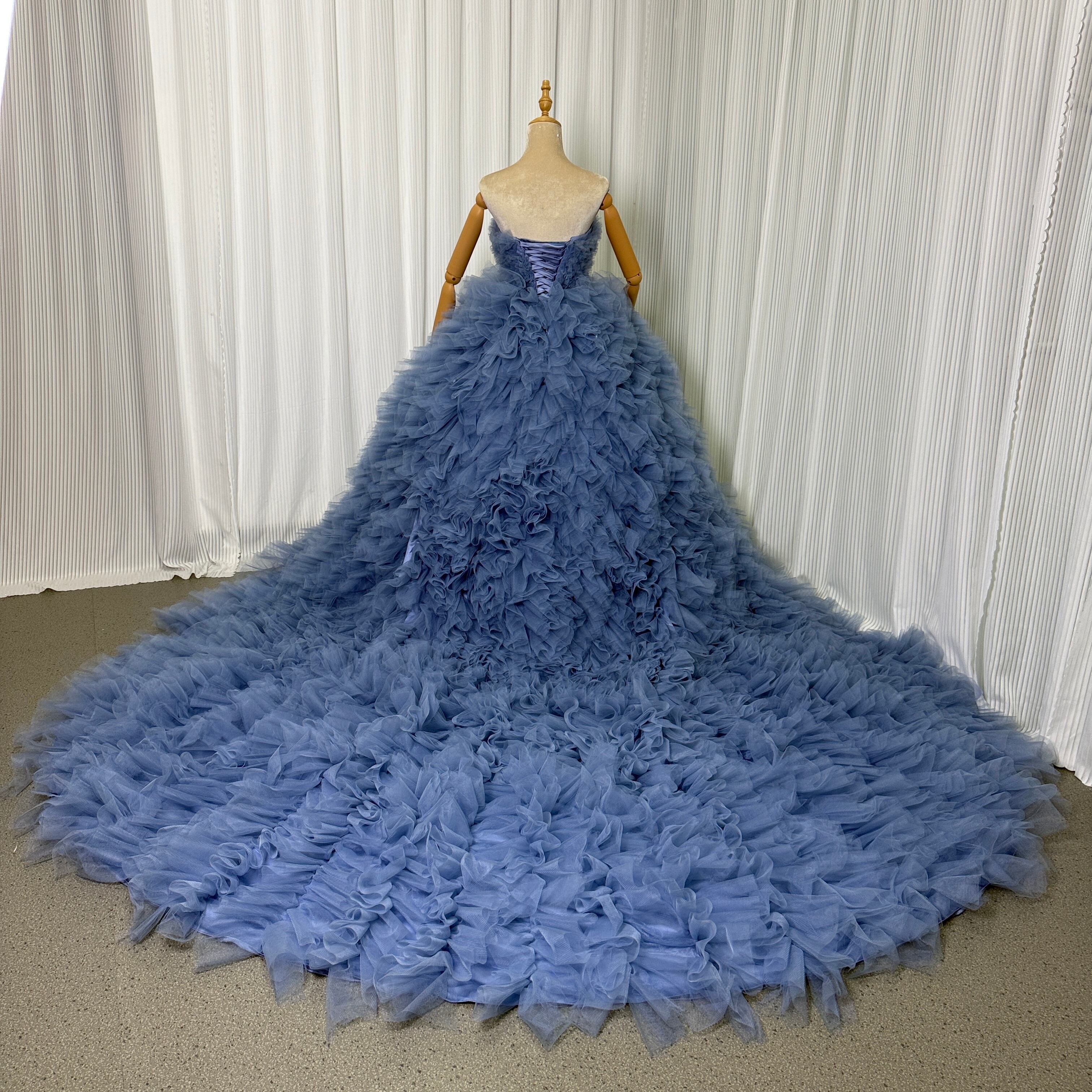 カラードレス ブルーグレー ベアトップ ソフトチュール 華やかなトレーン 柔らかく重ねたチュールスカート 披露宴/結婚式 もこもこドレス