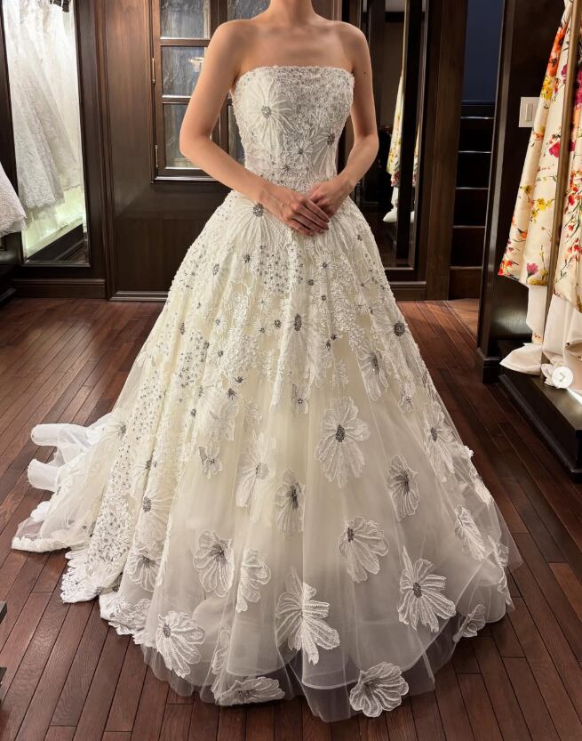 ウエディングドレス ホワイト 韓国風ドレス 花柄のモチーフ刺繍が美しく 短トレーン ベアトップ 目立つ 披露宴/結婚式 前撮り