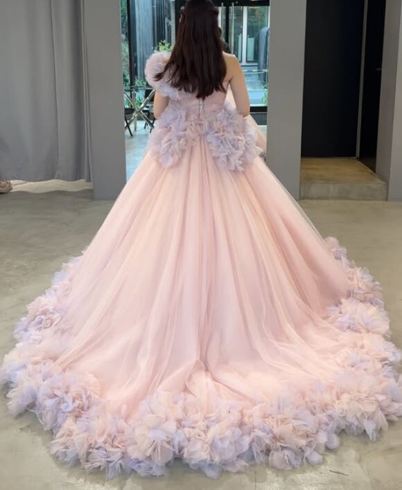 カラードレス ショルダー型 ピンク 編み上げ フリルトレーン ソフトチュール 花嫁 前撮り