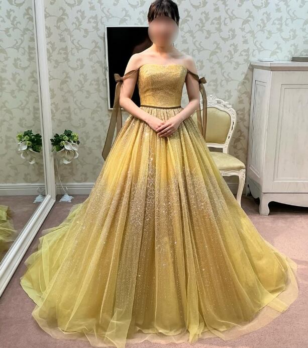カラードレス ゴールド リボン風オフショルダー キラキラグリッターチュール 編み上げ 華やかなトレーン 花嫁 前撮り