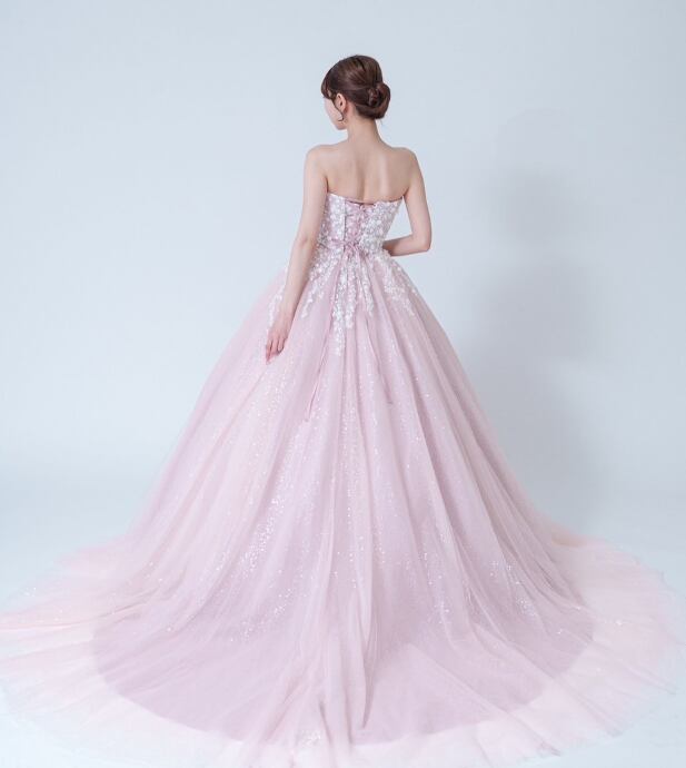 カラードレス ピンク 繊細レース キラキラグリッターチュール 華やかなトレーン 編み上げ 绮丽な 披露宴/結婚式 前撮り
