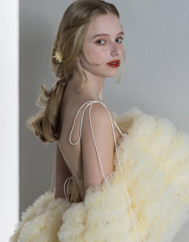 カラードレス パステルイエロー キャミソール ソフトチュール スレンダーライン 編み上げ 前撮り